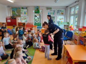 8 maja nasze przedszkole odwiedziła policja. Panie z policji przeprowadziły zajęcia edukacyjne na temat bezpieczeństwa dzieci w domu i w przedszkolu. Wytłumaczyły dzieciom jak należy zachować się w sytuacji zagrożenia,