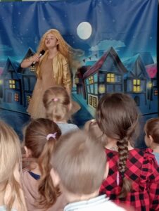 8 grudnia Przedszkolaki oraz uczniowie klasy I i II obejrzeli przedstawienie teatralne pt. „Listy do Zimy” w wykonaniu krakowskich aktorów z teatru Kokon. Dzieci były zachwycone wspólnymi zabawami z Panią