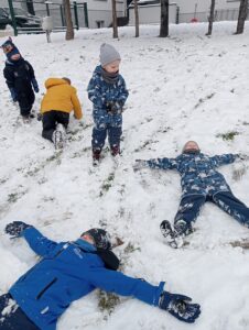 Korzystając z uroków tegorocznej zimy przedszkolaki bawiły się na śniegu w naszym przedszkolnym ogrodzie. Dzieci oddały się zimowemu szaleństwu, zjeżdżając na sankach, rzucając śnieżkami i robiąc śnieżne aniołki.