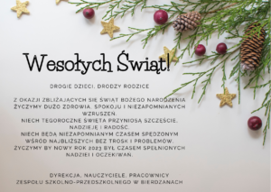 Konkurs „Najpiękniejsza choinka” zorganizowany przez Zespół Szkolno-Przedszkolny w Bierdzanach został rozstrzygnięty. Na konkurs wpłynęło 9 prac. Wszystkie prace prezentowały wysoki poziom artystyczny i spełniły wymagania określone w regulaminie konkursu. Doceniając